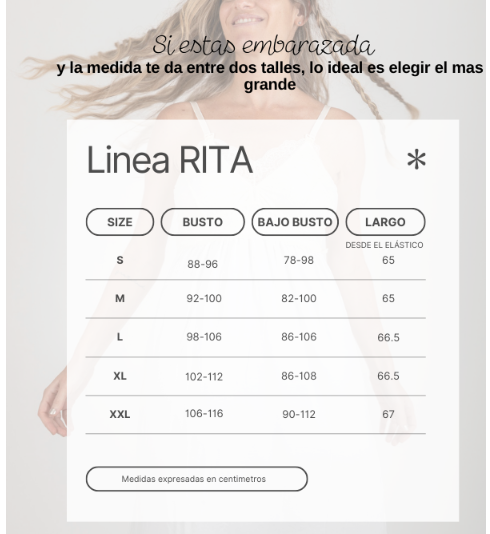 Talle XL: corresponde a un 110 de busto, el contorno del elástico sin estirar es de 84cm y estirado de 108cm