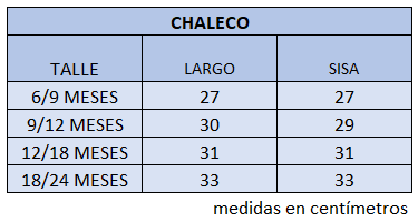 Chaleco tejido con conejitos súper tiernos. Te recomiendo chequear la tabla de talles para ver la medida correcta para tu peque.