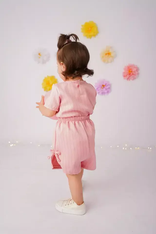 Remerita mangas cortas con moños en el frente y broche en la espalda, short con cintura elástica con elástico que no aprieta y abertura pequeña en los costados para mayor comodidad y estilo.