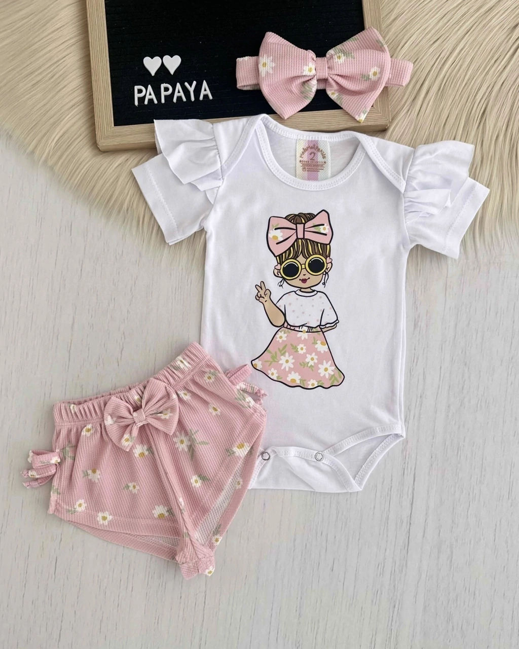 Trío de body con volados en mangas de jersey, short y vincha de tela waffle.